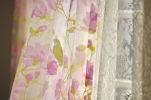 ピンクの花柄模様に小鳥をモチーフにしたプリントオパールレース/カーテン・レース・リビング・インテリア・クッション・カーテンレール・ピンク・小鳥柄・花柄