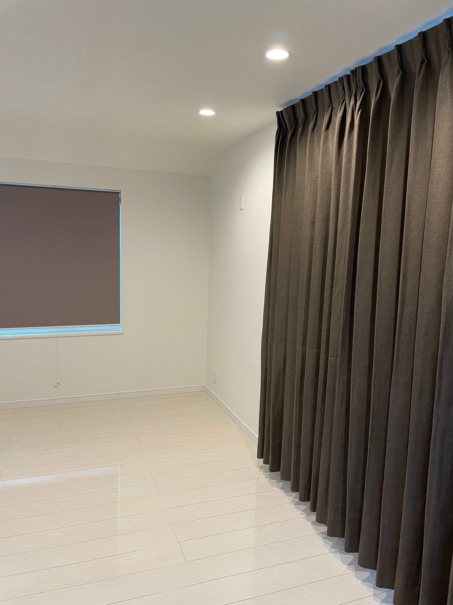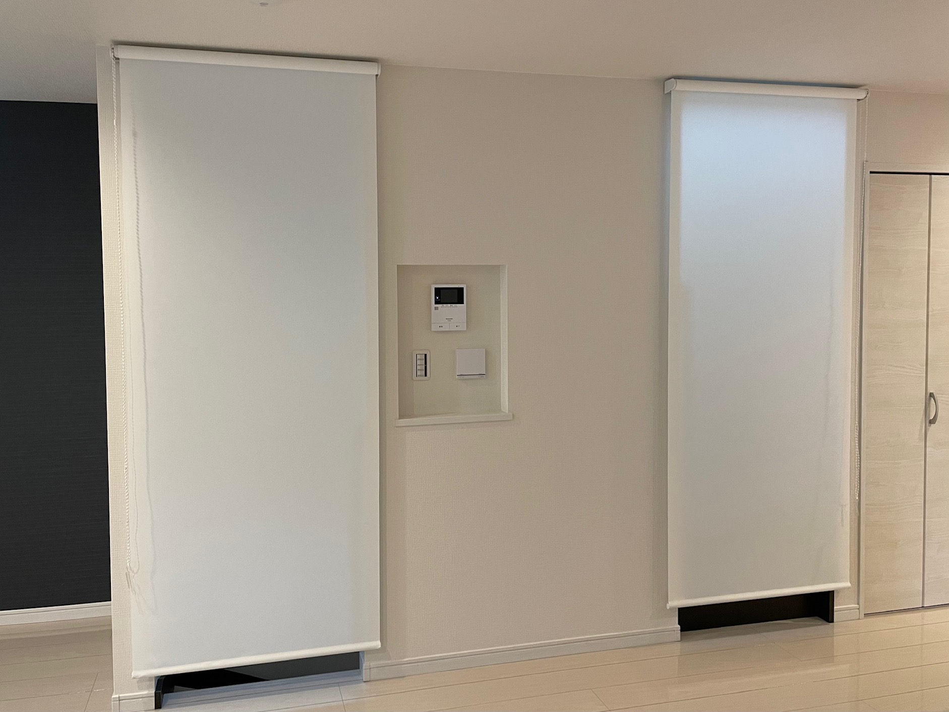 こちらは壁の色に合わせたホワイト系の生地のロールスクリーンです😌