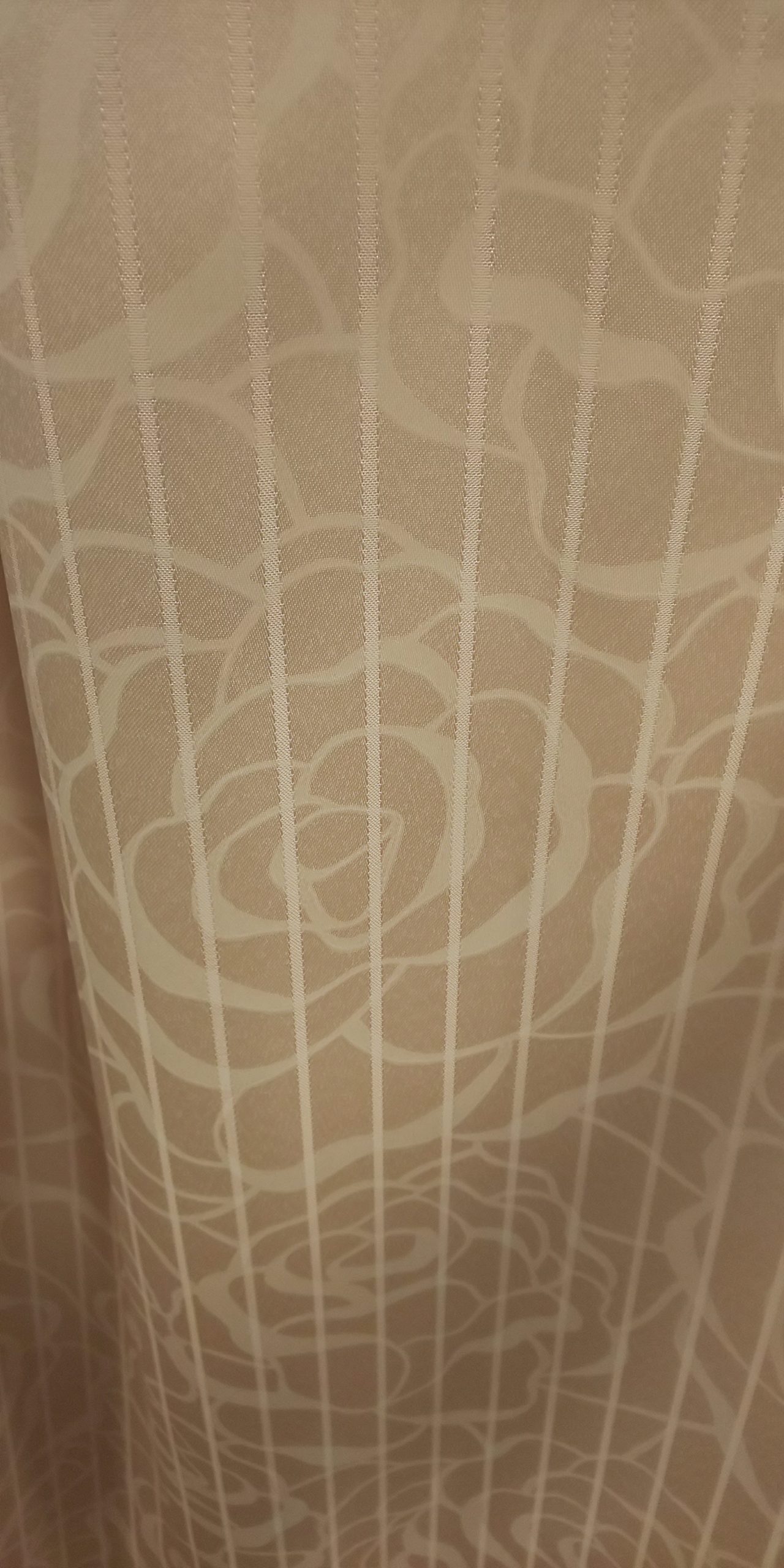 ピンク系の花柄とストライプのカーテンに、ひし形の縦ラインが入ったレースを合わせました。