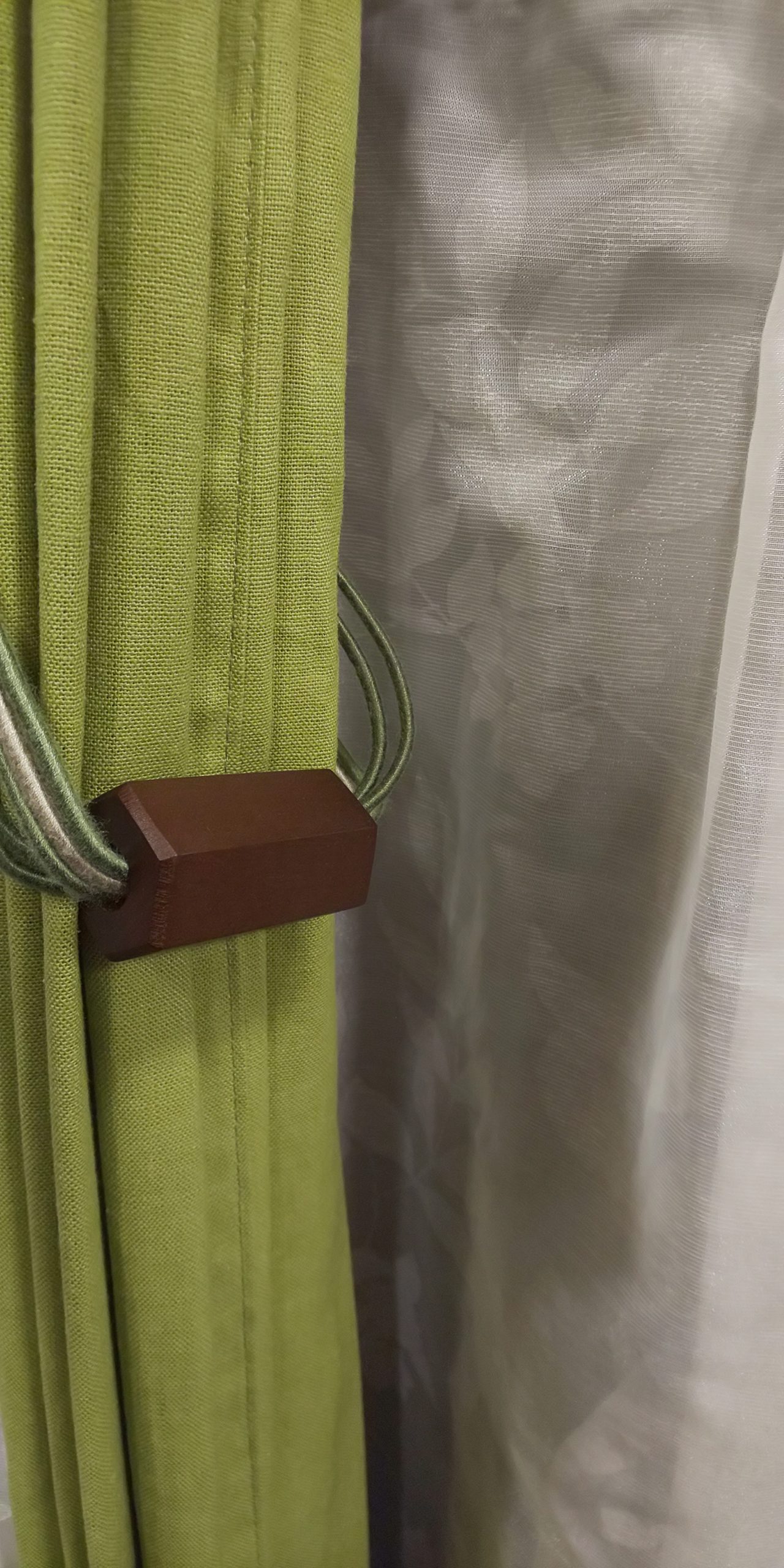 緑の無地カーテンに葉っぱ柄のレースを合わせ、木のような質感のタッセルを選ぶことで自然っぽい雰囲気にしてみました!