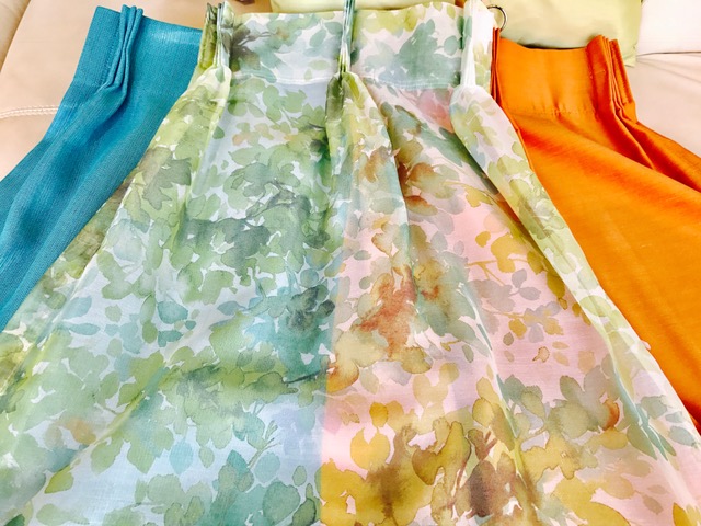 このカーテンはレースカーテンなのですが、お店では厚手のカーテンの手前に持ってくるシアートップとしてディスプレイしています♪