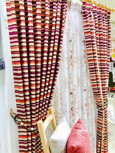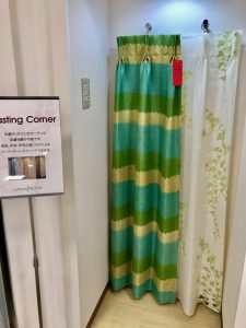 ボーダーの厚手のカーテンは、和風テイストの「いろはな」シリーズのものです。