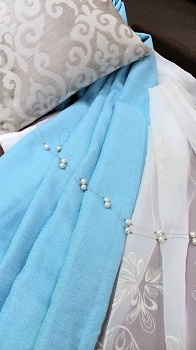 パッと目を惹く鮮やかな水色のドレープカーテンと淡いクリーム色の刺繍が入ったレースカーテンのコーディネートです(*^_^*)