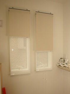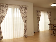 「H様の今回お選びいただいたドレープカーテンは、2種類あります。どちらも別の生地ですが、柄に使用されている色味が近く、統一感があります。白地に茶系の大柄の植物が描かれた生地は、ナチュラルな雰囲気の中にも上品さがあり、リビングにはお薦めです。また小窓はロールスクリーンにし、日中プライバシーを守りつつ、採光したい窓にはレースを組合せたダブルタイプにしました。納品後、レースの透け感を気に入っていただき、追加のご注文をいただきまして、ありがとうございました。」