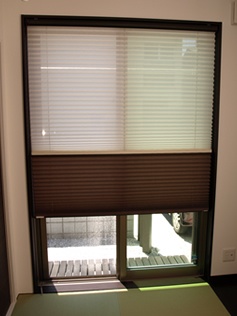 想像以上の出来上がりで満足しています。ウッドブラインドに憧れていたので、リビングと続きの和室の掃き出し窓には最初は濃いブラウンのウッドブラインドを取り付けてみたいと考えていました。採寸に来てもらったときに、採寸のスタッフに相談したところ、ウッドブラインドを取り付けると上げ下げが重たく、また濃いブラウンの色は見た目も重たく感じるとアドバイスにてもらって、その場でカタログを見てプリーツスクリーンを取り付けることに変更しました。プリーツスクリーンは値段もドレープカーテンとレールを取り付けたときとほぼ変わらない値段でした。取り付けてみて、やはりプリーツスクリーンにして正解でした。上げ下げが軽くて3パターンの使い方が楽しめ、想像以上の出来上がりで満足しています。また、リビングのクッションもカーテンとあわせてコーディネートしました。 お気に入りのファブリックです。