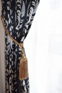 リビングのカーテンだけはこだわろうと夫婦で話し合っていて、デザイン性のある大人っぽいイメージのカーテンにしたいと考えていました。タッセルもこだわって少しゴージャスな感じの房のついたタッセルを選びました。プレミアムコレクションの中にイメージに合うカーテンを見つけることができたので、カーテンが決まってからリビングの照明を選び、カーテンの雰囲気に合うシャンデリアを見つけて購入しました。レースとドレープ、レールの組合せが合うのかが想像つかなかったのですが、実際に取り付けてみたらよく合っていてイメージ通りのリビングになりました。